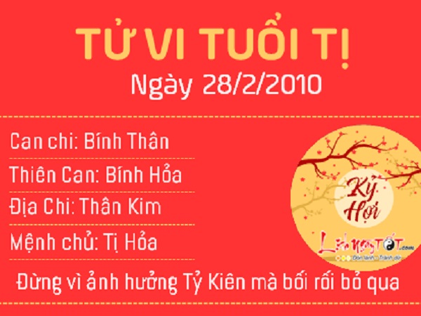 Do xuất hiện của Kiếp Tài nên tuổi Tị có thể phải đối mặt với những lời đánh giá, chỉ trích mà bạn không mong muốn. Vốn là người thẳng thắn có thể nói ra ý kiến của mình bất kể trong hoàn cảnh nào nhưng bạn nên lựa đúng thời điểm thích hợp nhé. Có những khi lời bạn nói ra chỉ khiến chính bản thân mình bị tổn thương mà thôi đấy.