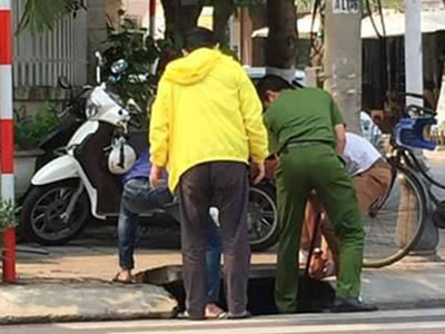 Công an Đà Nẵng giúp du khách Hàn lấy điện thoại rơi dưới cống