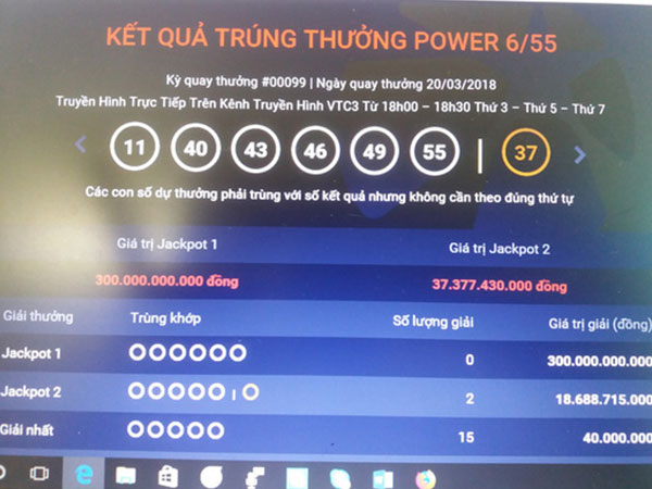 Sáng 21-3, Công ty Xổ số điện toán Việt Nam (Vietlott) cho biết kỳ quay số mở thưởng loại hình vé số Power 6/55 ngày 20-3 đã xác định 2 vé trúng thưởng Jackpot 2 trị giá 37,36 tỉ đồng, được bán từ điểm bán hàng ở TP HCM và tỉnh Kiên Giang.