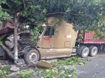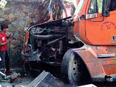 Chiếc xe container chở đầy sắt phế liệu tông vào 4 nhà dân, gây thiệt hại nặng về tài sản.