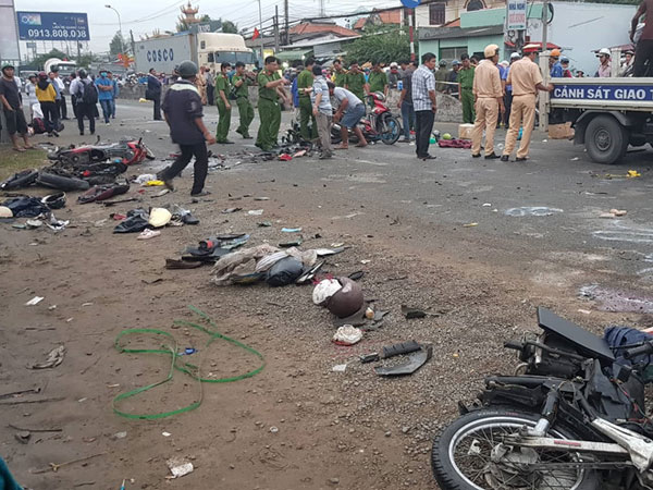 Hàng chục xe máy nát bấy, mảnh vỡ xe nằm lăn lóc trên đường, nhiều xe máy khác kẹt dưới gầm xe đầu kéo trong khi 6 người thiệt mạng, 25 người phải đi cấp cứu sau vụ tai nạn.