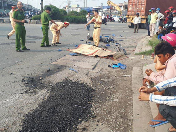 Sau khi ép xe máy, xe container kéo lê xe máy một đoạn trên đường rồi hất văng lên phần đường dành cho người đi bộ khiến nạn nhân chết tại chỗ.