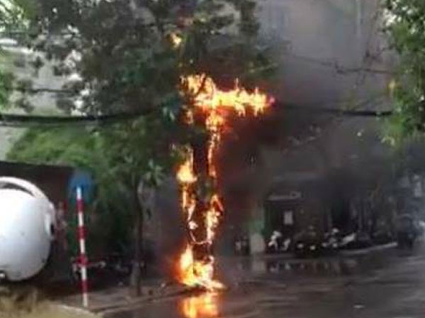 Một cột điện trên phố Thụy Khuê (quận Tây Hồ, Hà Nội) bốc cháy và lan nhanh sang bó dây cáp quang khiến người dân hoảng hốt, đám cháy xảy ra ở địa bàn có đông dân cư sinh sống.