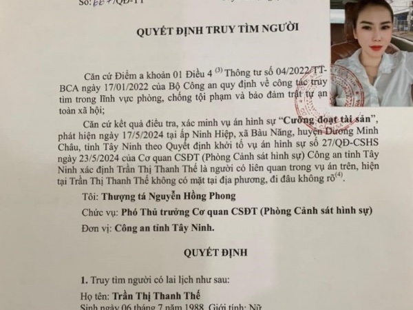 Sáng 14/6, Cơ quan CSĐT Công an tỉnh Tây Ninh cho biết, đang truy tìm Trần Thị Thanh Thế (SN 1988, ngụ xã Bàu Năng, huyện Dương Minh Châu) do liên quan đến một vụ án cưỡng đoạt tài sản.