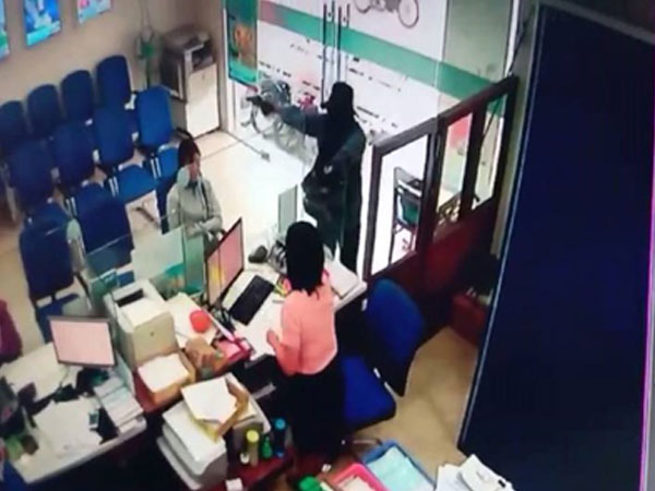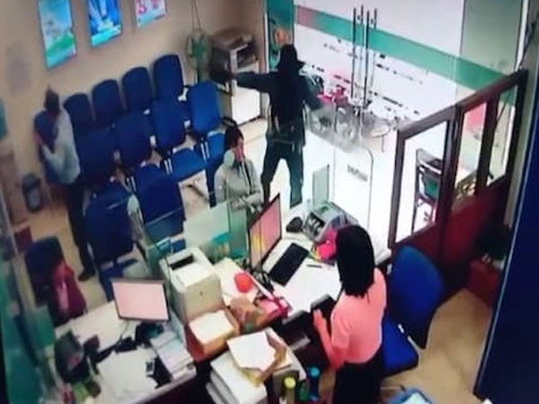 Tên cướp chĩa vật giống súng đe dọa, dồn bảo vệ lùi vào góc phòng. Hắn ném túi nylon yêu cầu nữ nhân viên bỏ tiền vào đó.