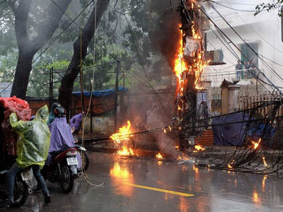 Hà Nội: Lửa bao trùm cột điện trong mưa lớn