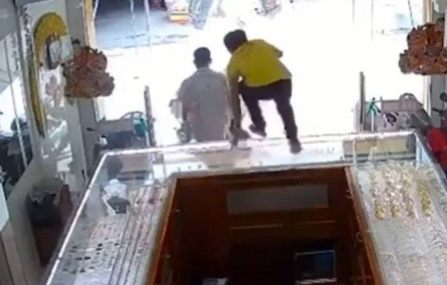 Thấy người đàn ông cầm dây chuyền bỏ đi, nhân viên tiệm vàng đã "phi thân" qua tủ kính, ôm chặt và ghì cổ nghi phạm.