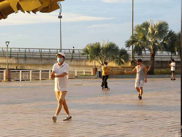 Người Đà Nẵng bịt khẩu trang, đội mũ chống giọt bắn tập thể dục