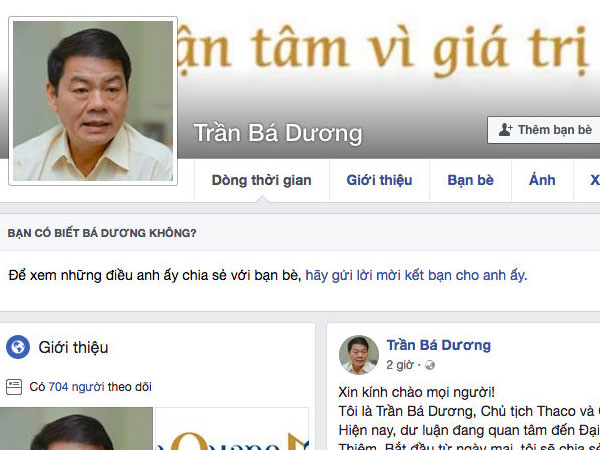 Tài khoản facebook ông Trần Bá Dương, Chủ tịch THACO và Công ty Đại Quang Minh, đã biến mất sau khi tuyên bố cung cấp thông tin về Công ty Cổ phần Đầu tư Địa ốc Đại Quang Minh và dự án Sala tại Khu đô thị mới Thủ Thiêm (quận 2, TP.HCM).