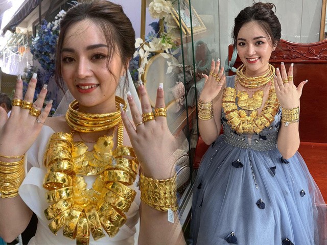 Trong ngày trọng đại, cô dâu Huỳnh Như (Cần Thơ) đã nhận về 50 cây vàng. Hình ảnh đeo vàng trĩu cổ của nàng dâu này khiến nhiều người nhiệt tình "xin vía".