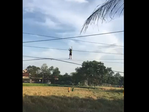 Không hiểu kích thước con diều to lớn đến đâu mà một cậu bé suýt bị món đồ chơi dân gian kéo lên không trung nơi những đường dây điện chằng chịt đang đợi sẵn.