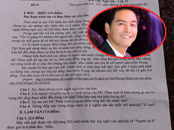 Mới đây một bạn học sinh đã chia sẻ hình ảnh đề thi học kỳ môn văn trường mình, trong đó, điều khá bất ngờ và thú vị là MC Phan Anh đã trở thành nhân vật chính trong đề thi.