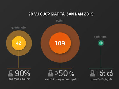Quận 1 của TP HCM đứng đầu về số vụ cướp giật xảy ra trong năm 2015 với 109 vụ; xếp thứ 2 là Hoàn Kiếm (Hà Nội) 42 vụ. Trong khi đó, quận Hải Châu của Đà Nẵng chỉ xảy ra 3 vụ.