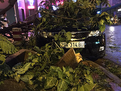 Chiều nay, một cơn mưa giông lớn với gió giật khủng khiếp đã biến đường phố Hà Nội thành một "bãi chiến trường" thực sự với cây cối đổ rạp khắp nơi, thậm chí làm bật cả vỉa hè, lật ô tô tải và có cả người chết.
