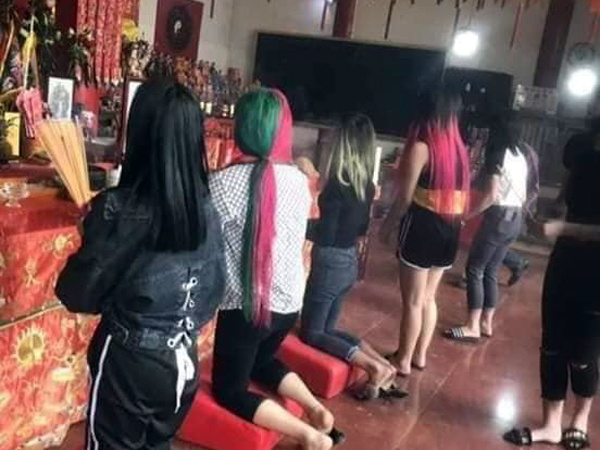 Nhóm bạn gái nhuộm tóc xanh đỏ, diện hẳn đồ ngủ hở rốn lên chùa cầu may gây tranh cãi