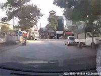 Rất may mắn nhờ tiếng còi của chiếc xe tải gần đó, người đàn ông đã thoát được tình thế hiểm nghèo lúc đang nhặt chiếc mũ bảo hiểm bị đánh rơi.