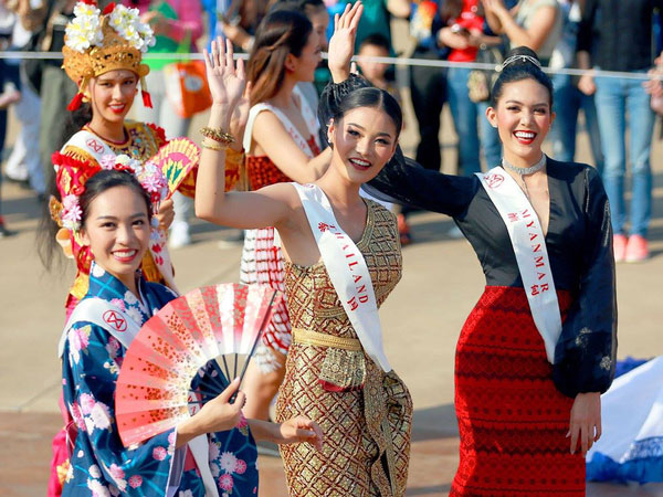 Mỹ Linh mặc áo tứ thân, khoe sắc bên dàn Hoa hậu Thế giới