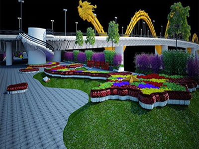 Đường hoa xuân tại Đà Nẵng có vườn hoa hình bản đồ Việt Nam với những địa danh như Hoàng Sa, Trường Sa, Côn Đảo, Phú Quốc... được làm bằng hàng trăm cây đào Nhật Tân.