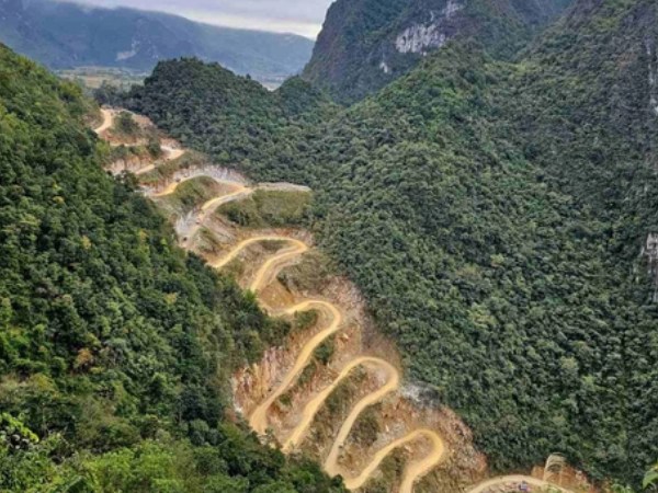 Khung cảnh núi đá như được phủ một màn tuyết trắng xoá, Đèo Thung Khe (Đá Trắng) uốn lượn, quanh co như dải lụa mềm vắt ngang sườn núi, ẩn hiện huyền ảo trong màn sương buổi sớm.