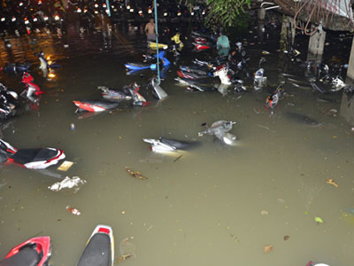 Tối 8/10, triều cường đạt đỉnh 1.64m vượt báo động III khiến hàng loạt tuyến đường phố TP.HCM thành sông. Nhiều người dân hết sức vất vả mới vượt qua được tuyến đường ngập để về nhà.