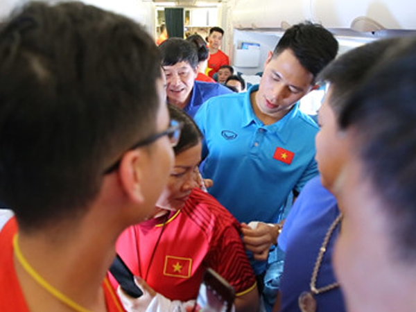 Đình Trọng mất hơn 10 phút mới có thể di chuyển về chỗ ngồi, trong khi đó Duy Mạnh phải "trốn" trong khu vực tiếp viên khi CĐV vây kín, chờ đợi để xin chữ ký, chụp ảnh.