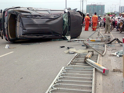 Chiếc xe ô tô do tài xế 41 tuổi đang lưu thông thì mất lái, tông văng 22 mét dải phân cách rồi lao qua phần đường xe hai bánh, tông một xe máy khiến hai người bị thương.