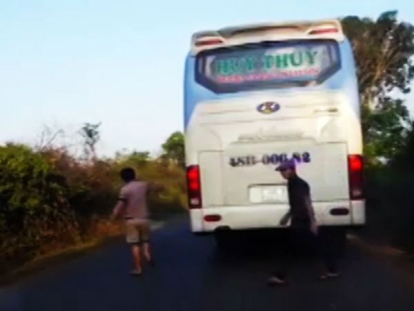 Chiếc xe khách sau khi lấn làn đã hất một người đi xe máy đi sát lề đường bên trái văng vào bụi. Sau khi gây tai nạn, 2 người trên xe khách xuống xe nhưng chỉ xem xét xe của mình rồi bỏ mặc người bị nạn lên xe đi tiếp.
