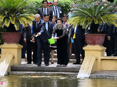 Sau cuộc hội đàm với Chủ tịch nước Trần Đại Quang, Tổng thống Mỹ Obama cùng Chủ tịch Quốc hội Nguyễn Thị Kim Ngân đi bộ từ Phủ Chủ tịch sang Nhà sàn Bác Hồ, dạo bước thong thả trong khu nhà sàn, cho cá ăn tại ao cá Bác Hồ.