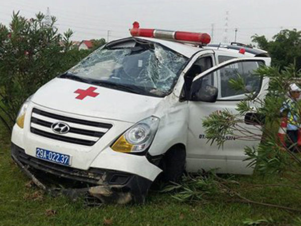 Đang chở bệnh nhân từ Hà Nội về Thái Nguyên điều trị thì bất ngờ chiếc xe cứu thương mất lái đâm vào giải phân cách khiến 3 người gặp nạn.