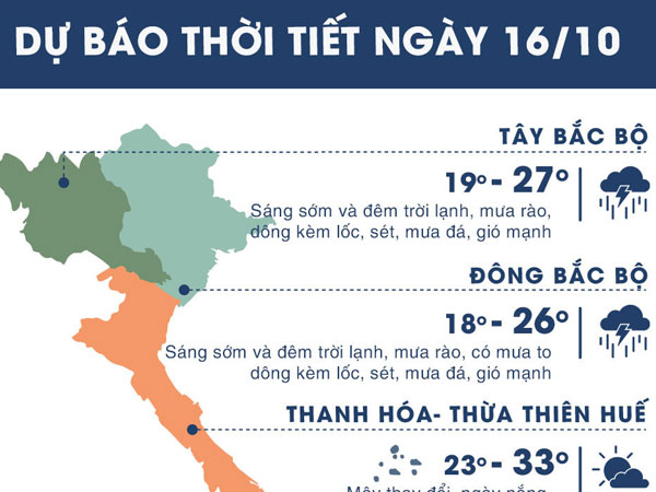 Ngày 16/10, không khí lạnh khiến các tỉnh Bắc Bộ chuyển lạnh với nhiệt độ thấp nhất 18 độ C, Hà Nội 21 độ C. Ngoài ra, khu vực này mưa rào, có nơi mưa lớn, dông kèm gió giật mạnh.