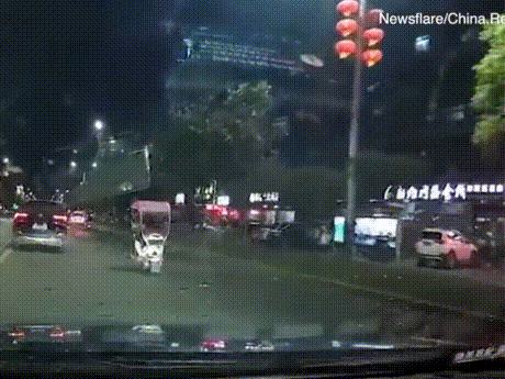 Tấm kim loại bất ngờ rơi xuống đúng ngay vị trí chiếc xe máy đang di chuyển khiến cả gia đình 3 người đang ngồi trên xe đều bị mắc kẹt ở bên dưới.