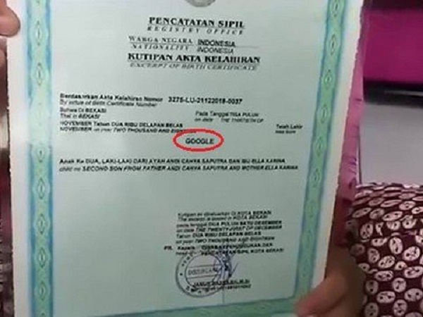 Cặp vợ chồng người Indonesia đặt tên cho con trai mà không kèm họ hay bất kỳ tên đệm nào.