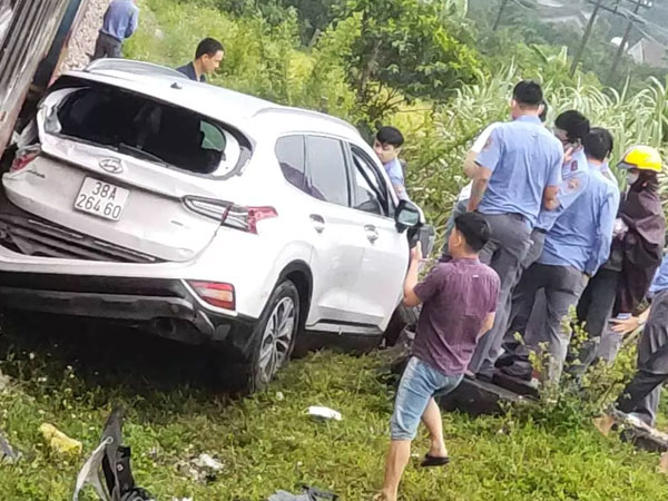 Xe ô tô Hyundai Santa Fe băng qua đường sắt bị tàu hỏa tông bay xuống ruộng, 5 người trên ô tô thoát chết.