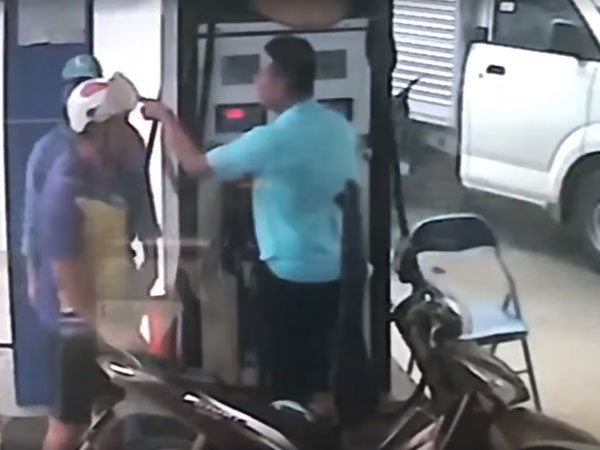 Khách bắt nhân viên, trưởng cây xăng quỳ xuống, lấy bình trà đập vào mặt
