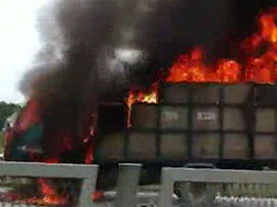 Xe tải bốc cháy ngùn ngụt trên xa lộ Hà Nội
