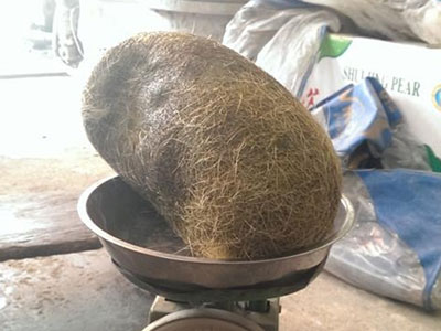 Một vật thể lạ đươc cho là "cát lợn" với kích thước to, màu vàng ươm, mùi vị thuốc bắc và có cân nặng đến 2,8kg vừa được tìm thấy tại Phúc Lâm (Mỹ Đức, Hà Nội).
