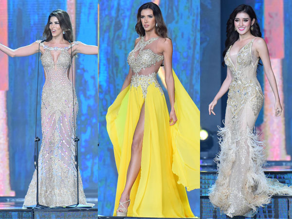 Người đẹp Ấn Độ, Lào, Indonesia mang lên sân khấu những bộ cánh cồng kềnh, được chăm chút từng chi tiết nhỏ. Đại diện Việt Nam, Huyền My, diện áo dài truyền thống nặng 30 kg.