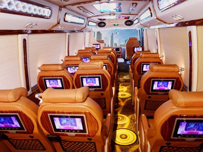 Chiếc xe khách 29 chỗ được thay thế nội thất, giảm xuống 19 chỗ ngồi và bọc da cao cấp. Trần gắn hàng nghìn bóng đèn LED tạo bầu trời sao như trên xe Rolls-Royce.