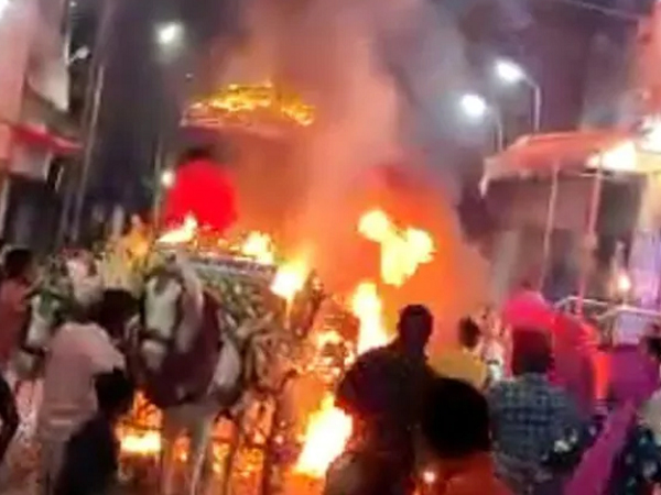 Trong clip sau (quay ở Maharashtra, Ấn Độ), 2 nam giới vẫn điềm nhiên nói chuyện và ăn các món ăn của tiệc cưới dù nơi đây đang xảy ra hỏa hoạn nghiêm trọng do pháo hoa và phải cần đến lính cứu hỏa mới dập được lửa.