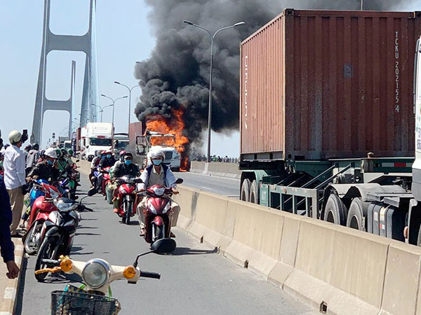 Container bốc cháy trên cầu Phú Mỹ, giao thông ùn tắc nghiêm trọng