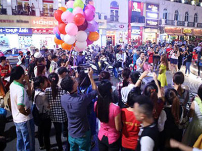 Tối 5.11, đường Đinh Tiên Hoàng (Hoàn Kiếm, Hà Nội), đoạn gần đài phun nước Hồ Gươm ùn tắc hơn nửa giờ đồng hồ vì màn cầu hôn của một chàng trai với tân hoa khôi sinh viên Hà Nội.