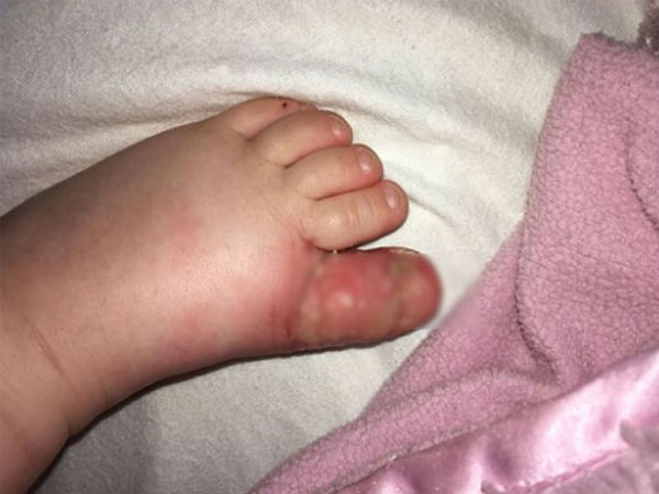 Sau khi giẫm phải bãi nước tiểu của chó, ngón chân bé gái 18 tháng tuổi bị nhiễm trùng, sưng to, buộc phải phẫu thuật.
