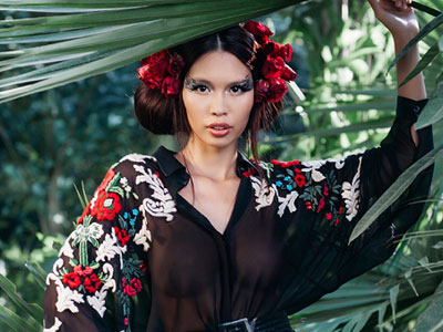 Chân dài khoe vẻ đẹp ấn tượng với kiểu tóc búi phồng to, kết hoa hồng đỏ, tạo dáng giữa thiên nhiên.