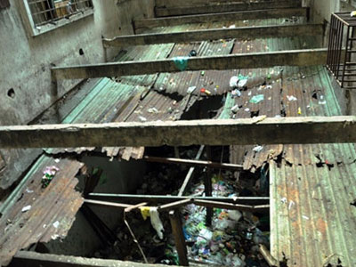 Bên trong chung cư 727, sự ẩm thấp, hoang lạnh luôn hiện hữu dù là buổi sáng. Rác rưởi vứt khắp nơi, bốc mùi hôi thối.