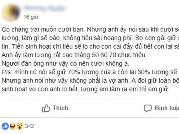 Trang 1Chưa kịp mừng vì chồng tương lai có thu nhập 70 triệu/tháng, cô gái điếng người khi biết chàng đòi giữ hết tiền lương
