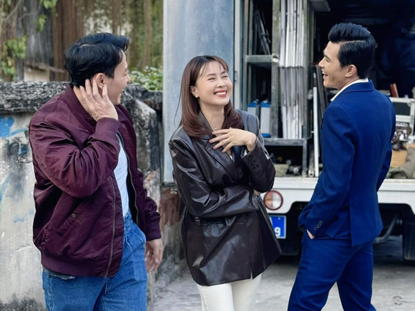 Hai tình địch Quang Sự và Trương Thanh Long cười nói vui vẻ với Hồng Diễm ở hậu trường 'Trạm cứu hộ trái tim' - điều không thể có trên phim.