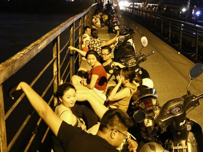 Tối 27/5, hàng trăm người dân thủ đô đổ lên cầu Nhật Tân hóng gió trong tiết trời nóng hầm hập. Xe đỗ tràn lan, hàng bán rong trà chanh bắt đầu xuất hiện.