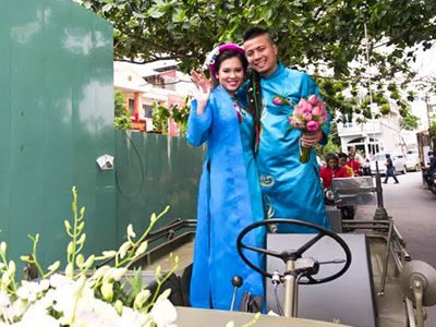 Lễ đón dâu với hơn 10 môtô cổ, đi đầu là xe jeep chở chú rể Wang Trần và cô dâu Thanh Nhân qua các tuyến đường Sài Gòn nhanh chóng thu hút sự chú ý.