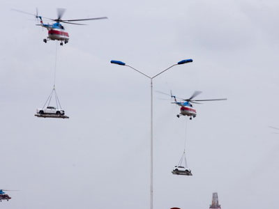 3 chiếc trực thăng cẩu ôtô bay theo đội hình trên bầu trời TP Vũng Tàu khiến người dân thích thú vì hình ảnh lạ lần đầu tiên xuất hiện.
