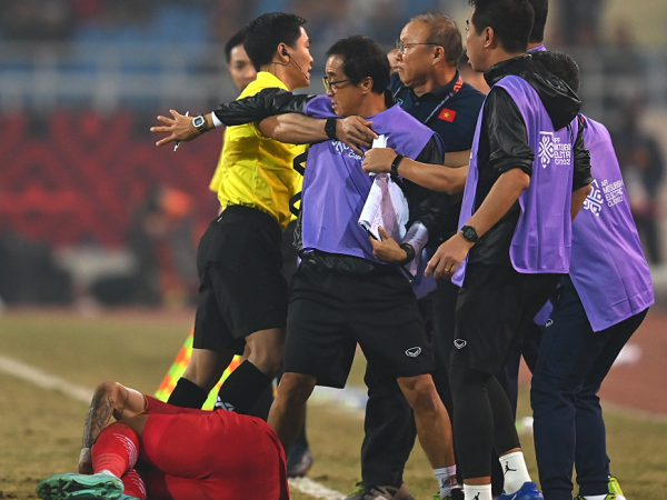 HLV Park Hang-seo nổi nóng, tính lao vào ăn thua với cầu thủ Asnawi bên phía Indonesia, sau khi anh thúc cùi chỏ vào vùng hiểm của Đoàn Văn Hậu.